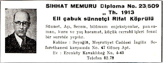Sıhhat memuru diploma no. 23/509 Th. 1913 Eli çabuk sünnetçi Rifat Köprülü Sünnet, aşı, serum, bilumum enjeksiyonlar, pansuman, kuru ve yaş hacamat, küçük cerrahi işleri fenni bir surette yapılır. Kabine : İstanbul, Beyoğlu meşrutiyet caddesi İngiliz sefarethanesi karşısında no. 47 Güneş apt Ev : Erenköy, Kavaklıbağ no. 4-43 Telefon 52.73 (1942) |
