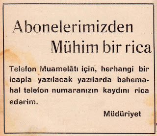 "Abonelerimizden çok mühim bir rica" 1942 Ptt İstanbul telefon müdürlüğü rehberinin muhtelif sayfalarında yer alan nostaljik ve kibar ricalar.