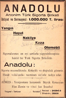 Anadolu Anonim Türk Sigorta Şirketi İhtiyat ve sermayesi 1.000.000 Türk lirası Yangın, hayat, nakliye, kaza, otomobil Sigortalarınızı en iyi şartlarla yaptırabileceğiniz hakiki bir Türk sigorta şirketidir. Anadolu : Sigorta muamelatında kolaylık ve doğruluk gösterir. Hasar vuku'unda tazminatı sür'atle tediye eder. Adres : Yeni postane karşısında büyük Kınacıyan han zemin ve 1. kat İstanbul (1936) |