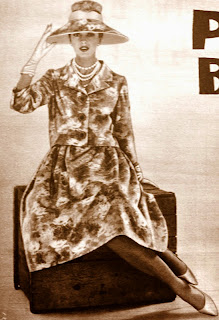 Bej ve beyaz emprime suradan yapılmış olan belden büzgülü bu geniş elbisenin aynı kumaştan üç iri düğmeli ve truvakar kollu bir ceketi vardır.