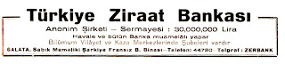 Türkiye Ziraat Bankası Anonim Şirketi Sermayesi : 30.000.000 lira Havale ve bütün banka muemelatı yapar. Bilumum vilayet ve kaza merkezlerinde şubeleri vardır. Galata, sabık memaliki şarkiye Fransız b. binası Telefon: 44730 - Telgraf : Zerbank (1936) |