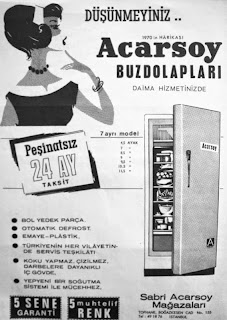 Düşünmeyiniz... 1970'in harikası Acarsoy buzdolapları daima hizmetinizde Peşinatsız 24 ay taksit Bol yedek parça, otomatik defrost, emaye-plastik, Türkiye'nin her vilayetinde servis teşkilatı, koku yapmaz - çizilmez - darbelere dayanıklı iç gövde, yepyeni bir soğutma sistemi ile mücehhez. 5 sene garanti - 5 muhtelif renk Sabri Acarsoy mağazaları Tophane, Boğazkesen cad. no. 155 Tel : 49 18 76 İstanbul |
