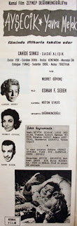 Kemal film Zeynep Değirmencioğlu'nu Ayşecik yavru melek Filminde iftiharla takdim eder. Cahide Sonku - Sadri Alışık Evrim Fer - Cavidan Dora - Hulusi Kentmen - Memduh Ün - Erdoğan Tunaş - Sadettin Erbil - Nubar Terziyan ve Nedret Güvenç Reji : Osman F. Seden Kamera : Kriton İlyadis Senaryo : Değirmencioğlu Şeker bayramında : İzmir: Büyük - Konak - Lale - Şenocak Trabzon : Saray - Samsun : Büyük - Kütahya : Saray - Adana : Asri, Ünal İskenderun : Kanatlı - Tarsus : Saray 12 Mart 1962 pazartesi Ankara : Cebeci - Ankara - Park - Sus - Alemdar - Emek - Renkli Zonguldak : Büyük - Belediye, Balıkesir : Şehir - Ege, Bursa : Marmara - Yeni ve Kemal film ile çalışan 500 sinemada. |