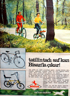 Tatilin tadı saf kan Bisan'la çıkar ! Yaz geldi mi, açılır çocukların gözü : Okullar bitmiş, ders kitapları kalkmıştır ortadan. Artık bin türlü eğlence bekler onları : deniz, kırlar, piknik, sporun her çeşidi... Bisan varsa altlarında tatillerinin tadına doyulmaz. Değil mi ki ? Bisan saf kandır onlara hem kendi içinde bir eğlence, bir spor yaratır hem de bir eğlenceden diğerine yetiştirir. Yorulmadan, yolda kalmadan. Çünkü tipi, boyu, rengi ne olursa olsun her saf kan Bisan'ın ortak bir özelliği vardır : Sürat, güçlülük, vefakarlık. 18 tip saf kan Bisan arasında onlara uyacak olanı vardır mutlaka...1973 |