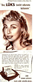Dany Robin cazip Fransız sinema yıldızı diyor ki : "Ben Lüks tuvalet sabununu kullanırım." Mükemmel bir ten ! İşte bir sinema yıldızının en kıymetli varlığı ! Sinema yıldızlarından onda dokuzu da, günlük tuvaletleri için saf ve latif olan Lüks tuvalet sabununa güvenirler. Bol miktardaki, kaymak gibi köpüğü hakiki bir güzellik müstahzarıdır ve Lüks tuvalet sabununun enfes kokusunu çok beğeneceksiniz. Lüks tuvalet sabununun köpüğü ile cildinizi biraz ovuşturunuz. Bundan sonra evvela sıcak su ile müteakiben soğuk su ile yıkayıp yumuşak bir havlu ile hafifçe kurulayın. Neticede bir sinema yıldızının ki gibi taze ve çok güzel bir tene sahip olacaksınız Lux toilet soap 2120 sinema yıldızının tercih ettiği güzellik sabunu...1960 |