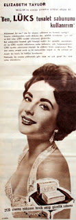 Elizabeth Taylor, Mgm'nin cazip sinema yıldızı diyor ki : Ben Lux tuvalet sabunu kullanırım. Mükemmel bir ten ! işte bir sinema yıldızının en kıymetli varlığı ! Sinema yıldızlarından onda dokuzu da günlük tuvaletleri için saf ve latif Lüks tuvalet sabununa güvenirler. Bol miktardaki kaymak gibi köpüğü hakiki bir güzellik müstahzarıdır ve Lüks tuvalet sabununun enfes kokusunu çok beğeneceksiniz. Lüks tuvalet sabununun köpüğü ile cildinizi biraz ovuşturun bundan sonra evvela sıcak su ile müteakiben soğuk su ile yıkayıp yumuşak bir havlu ile hafifçe kurulayın. Netice bir sinema yıldızının ki gibi taze ve çok güzel bir tene sahip olacaksınız. 2120 sinema yıldızının tercih ettiği güzellik sabunu...1960 |