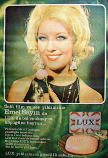 Ünlü film ve ses yıldızımız Emel Sayın'da Lux'ün bol ve okşayan köpüğüne hayran... "Pürüzsüz bir cilt kadında güzelliğin temelidir... Cilt ve vücut bakımı için Lux fevkalade bir tuvalet sabunu... Bu yüzden Lux'ü banyomdan eksik etmiyorum. Siz de benim gibi yapın." Lux yıldızların güzellik sabunu...1973 |