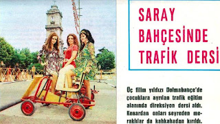 MİNİ OTOMOBİLLERDE MİNİ ETEKLER : Figen Say, Zeynep Aksu ve Zühal Aktan Dolmabahçe'de çocuklar için açılan trafik okulunda ilk çalışmayı yaparlarken büyük bir meraklı kalabalığının hücumuna uğradılar. Fakat üçü de halka aldırmadılar. Mini etekleriyle sere serpe oturdukları küçük otomobillerini bir saat boyunca zevk ve heyecan içinde durmadan yarıştırdılar...1970 |