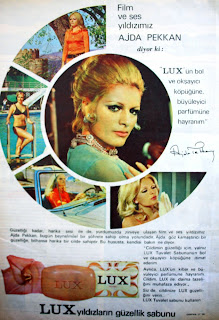 Film ve ses yıldızımız Ajda Pekkan diyor ki : "Lux'ün bol ve okşayıcı köpüğüne, büyüleyici parfümüne hayranım..." Güzelliği kadar harika sesi ile de yurdumuzda zirveye ulaşan film ve ses yıldızımız Ajda Pekkan, bugün beynelmilel bir şöhrete sahip olma yolundadır. Ajda, göz kamaştırıcı bir güzelliğe bilhassa harika bir cilde sahiptir. Bu hususta bakın ne diyor : "Cildimin güzelliği için yalnız Lux tuvalet sabununun bol ve okşayıcı köpüğüne itimat ederim. Ayrıca Lux'ün kibar ve büyüleyici parfümüne hayranım. Cildim lux ile daima tazeliğini muhafaza ediyor..." Siz de cildinize Lux güzelliğini verin... Lux tuvalet sabunu kullanın...1970 |