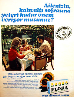 Ailenizin, kahvaltı sofrasına yeteri kadar önem veriyor musunuz ? Ekmeğinizde Flora evinizde sağlık Flora sürülmüş ekmek ailenize gün boyunca sağlık verecektir. Flora sürülmüş ekmek... Sağlık için bundan faydalı ne olabilir ? Flora sofra margarini sağlığa faydalı olduğu bilinen nebati yağlardan imal edilir. Ayrıca vücut için çok lüzumlu olan a ve d vitaminleri ile halis pastörize süt ihtiva eder. Flora buzdolabından çıktığı anda dahi ekmeğe kolaylıkla sürülür, yaldızlı kağıt ambalaj Flora'nın her zaman taze kalmasını sağlar. Flora sofra margarini, iyi bir gün Flora ile başlar...1970 |