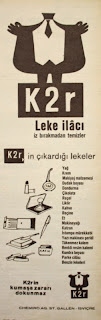 K2r Leke ilacı iz bırakmadan temizler K2r'in çıkardığı lekeler Yağ, krem, makyaj malzemesi, dudak boyası, dondurma, çikolata, reçel, likör, kahve, reçine, et, makine yağı, katran, ıstampa mürekkebi, yazı makinesi şeridi, tükenmez kalem, renkli resim kalemi, kundura boyası, parke cilası, benzin lekeleri K2r'in kumaşa zararı dokunmaz Chemiro Ag. St. Gallen - İsviçre (1962) |