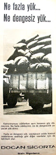 Ne fazla yük... Ne dengesiz yük... Kamyonunuzu yüklerken aşırı kazanca göz dikmeyiniz. Ne fazla yükleyiniz, ne de dengesizlik yapacak yük alınız. Fazla ve dengesiz yük vasıtanızın yolda kontrol imkanlarını azalttığı gibi diğer vasıtalar için de tehlikeli olur. Doğan Sigorta Sizin sigortanız (1970) |