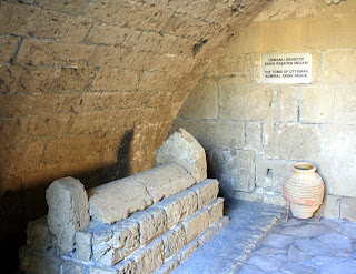 ne girdiğimizde kalenin avlusuna doğru ilerlerken iç merdivenlerin bulunduğu yolda bir duvarın dibinde bulunan mezar.