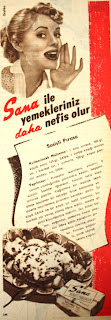 Sana ile yemekleriniz daha nefis olur ! Sosisli Pırasa Kullanılacak malzeme : 1 kg pırasa, 300 gr küçük sosis, 125 gr Sana, 1 çorba kaşığı dolusu un, 1 bardak süt, 1 yumurta, 100 gr kaşar peyniri rendesi, tuz, biber. Yapılması : Pırasalar temizlenir, yıkanır, 8 cm uzunluğunda parçalara kesilir, haşlanır ve süzülür. Sosisler iğnelenir, kaynar tuzlu suya atılarak pişirilir. Yağlanmış bir tepsiye veya ateşe dayanan bir tabağa ikiye bölünmüş sosislerle hazırlanmış pırasalar beraber dizilir. İki kaşık Sana ile bir kaşık un hafif kavrulur, bir bardak süt yavaş yavaş ilave edilir ve ateşte pişirilir. Koyulaşınca indirilir tuz, biber konur, soğutulur. Yumurta, kaşar peyniri ilave edilir, karıştırılır, pırasaların üzerine dökülür. Fırında kızartılır ve sıcak olarak servis yapılır...1960 |