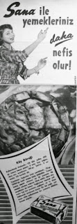 Sana ile yemekleriniz daha nefis olur ! Köy Böreği Kullanılacak malzeme : 1/2 kg yufka, 250 gr tuzsuz beyaz peynir, 2 orta boy soğan, dere otu, maydanoz, 150 gr Sana, 3 yumurta, 1/2 bardak süt. Yapılması : Soğanlar iyice çentiklenir, 75 gr Sana'da hafif ateşte iyice öldürülür. Tuzsuz beyaz peynir ufalanır ve 2 yumurta ile ateşten alınmış soğana ilave edilir. Dere otu, maydanoz da konur. Yağlanmış tepsiye yufkalar kat kat sıralanır, yağlanır ve iç ikiye bölünerek aralarına konur. En üst yağlı yufkaya sütle çalkalanmış bir yumurta dökülür, fırında pişirilir. Sana Nebati Margarin (1960 Grafika) |