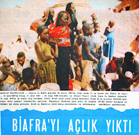 BİAFRA'YI AÇLIK YIKTI MAĞLUP BİAFRALILAR... Nijerya ve Biafra arasında 30 mayıs 1967'de çıkan savaş 31 ay devam etti. Biafra 30 mayıs - 10 ekim 1967'de Enugu, 11 Ekim 1967 - 22 Nisan 1969 Umuahia ve nihayet Owerri olmak üzere üç başkent değiştirdi. 12 ocak 1970'de de teslim olup haritadan silindi. Şimdi çoluk çocuk yollara düşmüşler. Hepsi de aç ve susuz. Resimde görülenler ikinci başkent Umuahia'dan geliyorlar. Kaçanların ifadesine göre yalnız bu bölgede 700.000 kişinin kursağına bir haftadır tek lokma girmemiş. Şimdi aç Biafra'nın ümidi dünya devletlerinin ve milletler arası teşkilatların yardımlarında... |