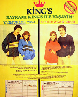 KİNG'S BAYRAMI KİNG'S İLE YAŞAYIN ! YAĞMURLUK 795.- TL - Silikonlandırılmış su geçirmez, özel bantlı, kapşonlu, kolu lastikli king's yağmurlukları posta masrafları dahildir. Renkler : Lacivert, mavi, turuncu - Bedenler : 1 - 2 SPOR KAZAK 745.- TL % 100 pamuk ipliğinden örülmüş, yaka, kol ağzı ve beli lastikli, özel armalı, şardonlu bisiklet yaka kazaklarımız posta masrafları dahildir. Renkler : Lacivert, kırmızı, kahverengi, bej - Beden : 1 - 2 Siparişinizi kupona açık adresinizle birlikte yazdıktan sonra zarfın içine koyarak "King's ticaret koll. şti. Yusuf paşa Sadi çeşmesi sokak no : 31 - 33 Aksaray - İstanbul adresine gönderiniz. Siparişiniz bir hafta içinde elinizde olacaktır. Malın tutarını sipariş elinize geçince ödeyeceksiniz...1980 |