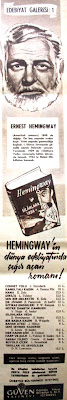 EDEBİYAT GALERİSİ 1 : Ernest Hemingway (Amerikalı romancı) 1898'de doğdu. 15 yaşında evden kaçtı. 20 yaşında gazeteciliğe başladı. 1. dünya savaşında gönüllü olarak İtalya'da çarpıştı. Yaralandı. 1929'da "Silahlara veda" romanıyla bütün dünyada tanındı. 1954'de Nobel mükafatını kazandı. SİLAHLARA VEDA Hemingway'in dünya edebiyatında çığır açan romanı ! GÜVEN YAYINEVİ - CAĞALOĞLU/İSTANBUL (1960) |