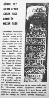 Günde 157 gram afyon çeken hacı Ahmet'in mezar taşı Edirnekapı mezarlığında bulunan bu mezar taşında aynen şunlar yazılı : "Yevmiye elli dirhem sülmen ve afyon ekleden 134 yaşında fevt olan rehai valit elhac Ahmet efendi ruhuna Fatiha sene 1216 muharrem" Urfalı hacı Ahmet efendi 134 yaşında ölmüştür. Günde 50 dirhem (157 gram) sülmen ve afyon kullanmaktaydı Hacı Ahmet. Bu mezar taşının üzerinde yazılı olanlar da bir insanın günde 1-2 gramdan fazla afyon kullanamayacağını iddia eden yabancılara iyi bir cevap teşkil eder. Dr. Aydın Uluyazman bizdeki uyuşturucu madde kullananların günde ortalama 5-6 gram beyaz zehir aldıklarını söylüyor. Urfalı hacı Ahmet efendi örneği bu ifadeyi en manalı şekilde doğruluyor. |