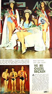 Altı güzel çıkmış meydane : 1970 güzelleri soldan : 2. Sema Arabacı, Türkiye güzeli Asuman Kızılgör Tuğberk ve 3. Çiğdem Yavuz (Zeynep Sun) üstte fotoğrafta. Altta erkekler güzellik yarışmasının galipleri : Soldan : 3. Haldun Sever, 1. Zekeriya Pehlivan, 2. Murat Sevim görülmekte. Kimi bel kırdı, kimi pazı şişirdi... Ve iki güzel seçildi... Amerika'nın Miami şehrinde yapılacak 1970 kainat güzellik yarışmasında Türkiyeyi 18 yaşında Erenköy kız lisesi mezunu ve banka memuru Asuman Kızılgör Tuğberk temsil edecek. Hürriyet gazetesinin tertiplediği bir yarışma sonunda 156 genç kız arasından seçilen bu defa ki güzelimizin vücut ölçüleri şöyledir. Boy 1.70 Kilo 54 Bel 60 Kalça 90 Göğüs 88. Tarabya oteli salonlarında Türkiye güzelinin seçildiği gün, Harbiye'deki bir jimnastikhane de İstanbul erkek güzellik yarışması yapılıyordu. Bu yarışmayı da 25 yaşında Zekeriya Pehlivan adında bir astsubay kazandı. Onun vücut ölçüleri ise şöyle Boy 1.78 Kilo 80 Bel 75 ve Pazı 43.... |