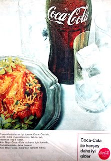 Coca - Cola ile her şey daha iyi gider... Yiyeceklerinizle en iyi içecek Coca Cola'dır. Coca Cola yiyeceklerinizin tadına tat. Neşenize neşe katar. Aile boyu Coca Cola sofranız için idealdir. Yemeklerinizde daha hesaplı aile boyu Coca Cola'dan istifade ediniz... (1968) |