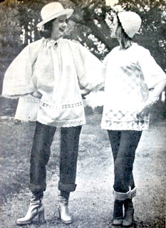 1972 yaz modasında romantizme dönüşün ilk belirtileri fistolu bluzlarda görülüyor. G. Saint Albin'in ince pamukludan, fisto kırmalarla süslü bir bluzu (solda). M. G. Store'un yine pamukludan bir tişörtü (sağda)...