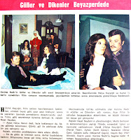 Güller ve Dikenler Beyaz Perdede * Kerime Nadir'in "Güller ve Dikenler" adlı eseri beyaz perdeye aktarıldı. Baş rollerinde Hülya Koçyiğit ve Kartal Tibet'in oynadıkları film, romanın dergimizde yayınlanması bittikten sonra sinemalarda gösterilmeye başlanacak. Hülya Koçyiğit film setinin hazırlanmasını beklerken elindeki beyaz gülü uzun uzun kokluyor, sonra da yaprakları üzerinde parmaklarını dolaştırıyordu usulca. Yıldız, gülü seyretmeye öylesine dalmıştı ki rejisör Nejat Saydam : - Aman Hülya hanım dedi, fazla koklamayın da beyaz gülünüz bozulmasın. Çünkü gül ile çekilecek daha çok sahnemiz var. Rejisör ardından prodüksiyonu idare edene döndü : - Siz de gülün işi bittikten sonra derhal buzdolabına kaldırın. Biliyorsunuz beyaz gül kolay bulunmuyor ! Dergimizde tefrika edilmekte olan Kerime Nadir'in "Güller ve dikenler" adlı romanı Acar film tarafından beyaz perdeye aktarılırken en büyük ihtimamı bir beyaz gül görüyordu ! Rejisör Nejat Saydam'ın yönetmenliğini, Melih Sertesen'in kameramanlığını yaptığı filmde romandaki tipleri şu oyuncular canlandırıyor : Verda : Hülya Koçyiğit Eşper : Kartal Tibet Ayhan : Salih Güney Nesteren : Sevgi Can Gülsüm kalfa : Müşerref Çapın Haşim bey : Nuri Altınok Eserin yazarı Kerime Nadir'in bugüne kadar 14 romanı beyaz perdeye aktarılmıştır...1970 |