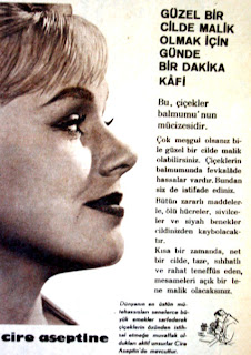 Güzel bir cilde malik olmak için günde bir dakika kafi Bu, çiçekler bal mumunun mucizesidir. Çok meşgul olsanız bile güzel bir cilde malik olabilirsiniz. Çiçeklerin bal mumunda fevkalade özellikler vardır. Bundan sizde istifade ediniz. Bütün zararlı maddelerle, ölü hücreler, sivilceler ve siyah benekler cildinizden kaybolacaktır. Kısa bir zamanda net bir cilde, taze, sıhhatli ve rahat teneffüs eden, mesameleri açık bir tene malik olacaksınız. Dünyanın en üstün mütehassısları senelerce büyük emekler sarf ederek çiçeklerin özünden istihsal etmeye muvaffak oldukları aktif unsurlar Cire Aseptine'de mevcuttur...1962 |