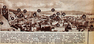 Hayat, "Yılın Şehri" seçilmesi münasebetiyle okuyucularına İstanbul'un bir panoramasını veriyor. İlk kısmını bugün orta sahifelerimizde sunduğumuz yukarıda tamamı görülen bu panoramada okuyucularımıza bir kolaylık olmak üzere şehrin belirli yerleri numaralandırılmıştır. 1- Beyazıt cami kubbesi, 2 - Topkapı sarayı, 3- Küçükçamlıca, 4 - Nuruosmaniye cami, 5 - Küçük Selimiye cami, 6 - St. İren kilisesi, 7 - Selimiye kışlası, 8 - Ayasofya, 9 - Haydarpaşa lisesi, 10 - Firuz ağa cami, 11 - Kayışdağı, 12 - Haydarpaşa silosu, 13 - Çemberlitaş, 14- Atik Ali paşa cami, 15 - Çorlulu Ali paşa cami, 16 - Haydarpaşa garı, 17 - Çorlulu Ali paşa ve Sinan paşa türbeleri, 18 - Sultanahmet cami, 19 - Dikilitaş, 20 - Merzifonlu kara Mustafa paşa türbesi... |