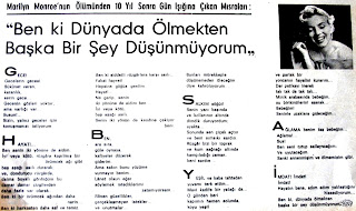 MARILYN MONROE'NUN ÖLÜMÜNDEN 10 YIL SONRA GÜN IŞIĞINA ÇIKAN MISRALARI : "Ben ki dünyada ölmekten başka bir şey düşünmüyorum." Gece ! Gecelerin gecesi. Sükunet veren, karanlık, serin gece... Gecenin gözleri yoktur, ama varlığı var... Susun ! Sizin, yalnız geceler için konuşmanızı istiyorum. Hayatı... Ben senin iki yönüne de aldım. İyi veya kötü, rüzgara kapılmış bir örümcek ağı gibi baş aşağı asılı durarak, ve dondurucu rüzgarda daima boyalı gördüğüm bu damar damar çizgilerden daha fazla var olarak. Ben ki bir örümcek ağından daha narin... Ben ki herkesten daha saf ve temiz... Ben ki şiddetli rüzgarlara karşılı asılı... Fakat hayret ! Hepsine göğüs gerdim... Hayat ! Ne garip, senin iki yönüne de aldım ben. İyi veya kötü, baş aşağı asılı. Senin iki yönünde kendine çekiyor beni. Ben, ara sıra, güle oynaya, kafiyeler düzerek giderim. Ama sakın bunu yüzüme vurmayın benim... Lanet olsun, eğer söylemek istediklerimi satamıyorsam... Sönen güzellikler, gerçekleşmeyen istekler... ve unutmalar... Bunları mürekkeple düşünemeden öleceğim diye kahroluyorum. Salkım söğüt ! Senin yanı başında ve kollarının altında dimdik duruyordum, ayakta... Sonunda sen çiçek açtın ve beni sımsıkı sardın. Rüzgar bizi bir toprak ve kum sağanağı altında kamçıladığı zaman, beni sardın... Yeşil ve kaba tahtadan yuvamı terk ettim... Mavi kadife bir yatağı da... O günden beri kapımın hemen solunda, koyu yeşil ve parlak bir yoncanın hayalini kurarım... Dar patikayı inerek "tak tak da tak tak"... Minik arabasında bebeğim, su birikintilerini aşarak... Bebeğim ! Seninle uzaklara gideceğim... Ağlama benim taş bebeğim... Ağlama !... Sus ! Ben seni tutup sallayacağım, ve uyutacağım... Sanki annen gibi ve ölmemişim gibi. İmdat ! imdat ! imdat ! Hayatın bana, adım adım yaklaştığını hissediyorum... Ben ki, dünyada ölmekten başka bir şey düşünmüyorum... |
