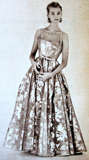 moda evinden, Nylfrance muslin tülden, üstü işlemelerle süslü, askıları sırtta çapraz kavuşan güzel bir tuvalet. Bol, uzun etek bele kontur plilerle toplanarak takılmıştır...1962