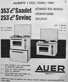 AUER'in 3 ateşli, ızgaralı, fırınlı 353 L Saadet (Çekmeceli) - 253 L Sevinç (Set üstü) Bütan gazı veya hava gazı kuzine özellikleri : 1- Fırın kırılmaz cam pencerelidir. İçi elektrikle aydınlatılır. 2- Fırın bir hindi pişirecek kadar geniş ve yüksektir. 3- Fırın içinde üstü çivili plaka tertibatlı ayrı ızgara vardır. AUER İMALAT A.Ş. AUER imal ettiği ve dağıttığı her cihazın devamlı bakımını yurdumuzun her tarafında sağlar...1967 |