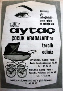 Yavrunuz göz bebeğinizdir, onun rahatı ve sağlığı için Aytaç çocuk arabalarını tercih ediniz. İstanbul satış yeri: Taksim belediye dükkanları no. 19 Tel: 47 49 95 Ankara satış yeri: Yenişehir Mithat paşa cad. no. 42 Tel: 17 62 90 Fabrika : Çağlayan sok. no: 1 Şişli - İstanbul Tel: 47 78 00 (1967) |