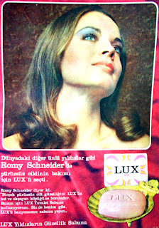 Dünyadaki diğer ünlü yıldızlar gibi Romy Schneider'de pürüzsüz cildinin bakımı için Lux'ü seçti. Romy Schneider diyor ki : "Birçok pürüzsüz cilt güzelliğini Lux'ün bol ve okşayıcı köpüğüne borçludur. Bunun için Lux tuvalet sabunu kullanıyorum. Siz de benim gibi Lux'ü banyonuzun sabunu yapın. Lux yıldızların güzellik sabunu (1972) |