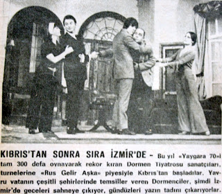 Kıbrıs'tan sonra sıra İzmir'de : Bu yıl "Yaygara 70"i tam 300 defa oynayarak rekor kıran Dormen tiyatrosu sanatçıları turnelerine "Rus gelir aşka" piyesiyle Kıbrıs'tan başladılar. Yavru vatanın çeşitli şehirlerinde temsiller veren Dormen'ciler şimdi İzmir'de geceleri sahneye çıkıyor gündüzleri ise yazın tadını çıkarıyorlar...1970 |