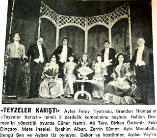 Ayfer Feray tiyatrosu Brandon Thomas'ın "Teyzeler karıştı" isimli üç perdelik komedisine başladı. Haldun Dormen'in yönettiği oyunda oyuncular bir arada görülmektedir. Güner Namlı, Ali Tara, Birkan Özdemir, Zeki Dinçsoy, Mete İnselel, İbrahim Alben, Zerrin Sümer, Ayla Musaballı, Bengü Şen ve Ayben Uz. Dekor ve kostümler Aydan Yay'ın... 1970 |