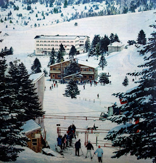 Uludağ geceleri : Uludağ'da hayat gündüz ve gece bambaşka bir güzelliktedir. Gündüzler spora ayrılmıştır, geceler ise eğlenceye. Sıcak şarapları içip karda hora tepenler, pavyon dönüşlerinde taksi yerine kar motosikletine binenler; dışarıdaki soğuktan kaçıp dans pistinde soluğu alanlar sanki ayrı birer alemde yaşıyorlar. Tipi altında tepelerden kaymayı göze alamayanlar ise şömine başında salon oyunları oynayarak vakit geçiriyorlar. Sağ dipte de teleferik görülüyor. |