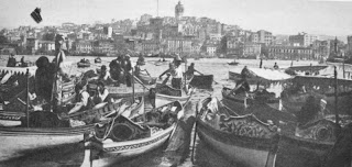 "Bir çeyrek Galata.." Yani beş kuruşu veren, tenteli kayığa kurulup püfür püfür karşıya geçiyor. Hatta 5 de değil, seyahat 4 kuruşa geliyor. Çünkü Galata'ya karadan geçilse 1 kuruş da köprü müruriyesi ödenecek... 1924 |