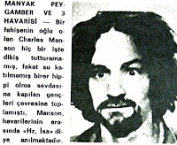 SHARON TATE CİNAYETİ Manyak Peygamber ve Üç Havarisi : Bir fahişenin oğlu olan Charles Manson hiç bir işte dikiş tutturamamış fakat su katılmamış birer hippi olma sevdasına kapılan gençleri çevresine toplamıştı. Manson havarilerinin arasında "Hz. İsa" diye anılmaktadır. |