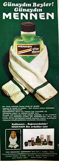 Günaydın beyler ! Günaydın Mennen Her sabah cildinizde doyum olmaz bir ferahlık, yepyeni bir tazelik ve canlılık... İşte, dünyaca meşhur Mennen after shave traş losyonu. Mennen after shave traş losyonu traş sırasındaki cilt yanmalarını giderir ve cildinize ferahlık verir. Dünyada 100 milyondan fazla erkeğin kullandığı ve biz erkeklerin seçtiği bütün Mennen çeşitleri gibi. Mennen after shave traş losyonu da size gün boyunca zindelik kazandırır. Eczane ve parfümeri mağazalarında Mennen bütün çeşitleriyle emrinizdedir. Kullanınız... Beğeneceksiniz ! Mennen biz erkekler için The Mennen company New York - London - Paris Türkiye distribütörü Tekmen parfümeri sanayi ve ticaret limited şirketi İstanbul Telefon : 46 19 88 - 46 31 15 Ankara Telefon : 17 66 93 İzmir Telefon : 32871 Adana Telefon : 5669 (1969) |