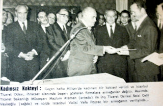 Kadınsız kokteyl : Geçen hafta Hilton'da kadınsız bir kokteyl verildi ve İstanbul ticaret odası, ihracat alanında başarı gösteren firmalara armağanlar dağıttı. Resimde ticaret bakanlığı müsteşarı Mazlum Ataman (ortada) ile dış ticaret dairesi reisi Celil Vayisoğlu (sağda) ve solda İstanbul valisi Vefa Poyraz bir armağanın verilişinde...1968 |