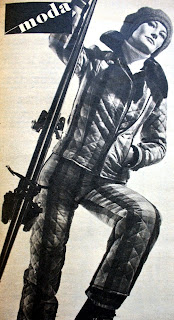 La Hutte'ye ait 1973 yılından bayan kayak kıyafeti ve kayak ekipmanları. Soğuğa karşı adeta bir zırh gibi... 1972 yılının ekose modası, 1973'de de hükmünü sürdürmekte. Moda tasarımcıları yeni yıl için hazırladıkları kayak kıyafetlerinde ekose kumaşlardan yararlanmakta. Hutte moda evinin etiketini taşıyan bu kıyafet ekose tergal ve kapitone dikilmiştir. Ekose kumaşın kapitone dikilmesi, hem göz okşayan bir görünüş kazandırmış, hem de daha ısıtıcı olmasını sağlamıştır. Kulakları örten yün başlık ve yün eldivenler kıyafeti tamamlayıcı diğer unsurlardır... |
