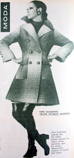 Aynı kumaştan yapılan düz, dik yakalı, kolsuz elbisesi ile takım, ekose yünlüden, spor bir manto.