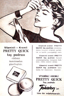 Vitaminli - Kremli PRETTY QUICK taş pudrası cildinizi kurutmadan güzelleştirir. Vitaminli kremli PRETTY QUICK taş pudrası yüzünüze, daima temenni ettiğiniz parlaklık ve kadife yumuşaklığını verir. Vitaminli kremli PRETTY QUICK taş pudrası benzeri müstahzarlardan tamamen farklıdır, cildin nemini almaz. Vitaminli kremli PRETTY QUICK taş pudrasını hakikaten bir denemeniz lazımdır. VİTAMİNLİ KREMLİ PRETTY QUICK Taş pudrası Tokalon'un lüks bir müstahzarıdır...1962 |