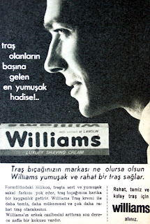 Tıraş olanların başına gelen en yumuşak hadise ! Williams luxury shaving cream Tıraş bıçağınızın markası ne olursa olsun Williams yumuşak ve rahat bir tıraş sağlar. Formülündeki silikon, tıraşta sert ve yumuşak sakal farkını yok eder, tıraş bıçağınıza harika bir kayganlık getirir. Williams tıraş kremi ile daha temiz, daha mükemmel ve çok daha rahat tıraş olacaksınız. Williams'ın erkek cazibesini arttıran son derece nefis bir kokusu vardır. Rahat, temiz ve kolay tıraş için Williams alınız. (1968) |