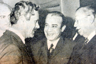 Yıldırım'ın dönüşü : Yılların sanatçısı Yıldırım Önal kendi kurduğu Büyük Ankara Tiyatrosunda "Foto Finiş" ile yeniden sahneye döndü. Oyunun galası çok renkli oldu. Yıldırım Önal fuayede misafir bakanlar İsmet Sezgin ve İhsan Sabri Çağlayangil ile görülüyor...1969 |