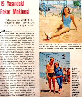 Rekora doğru : Yaşı kadar kupası olan Sevda Ün her gün 5 km yüzüyor. 4 defa milli olmuş. 100 metre Türkiye rekortmeninin amacı 200 ve 400 metre rekorlarını da elde etmek. "Attığım kulaçlar boşa değil, yeni rekorlara gitmeli." diyor...1970 |