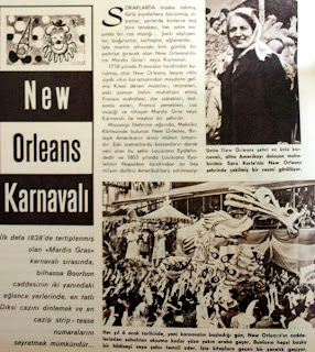 NEW ORLEANS KARNAVALI İlk defa 1838'de tertiplenmiş olan "Mardis Gras" karnavalı sırasında bilhassa Bourbon caddesinin iki yanındaki eğlence yerlerinde en tatlı Diksi cazını dinlemek ve en cazip strip-tease numaralarını seyretmek mümkündür. Her yıl 6 Ocak tarihinde, yani karnavalın başladığı gün New Orleans'ın caddelerinden sabahtan akşama kadar yüze yakın araba geçer. Bunların hepsi başka bir hadiseyi veya şahsı temsil eder. İşte üstte kitaplara geçen bir yaratık geçerken görülmekte. Altta New Orleans şehri ve kahramanı, en üstte ise muhabirimiz Sara Korle'nin fotoğrafı görülmektedir. |
