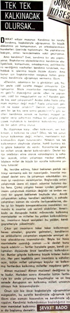 'nun 1962 yılında Hayat dergisi Sohbet köşesinde kaleme almış olduğu "Tek tek kalkınacak olursak." başlıklı köşe yazısı.