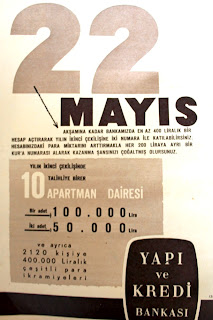 22 MAYIS 1962 AKŞAMINA KADAR BANKAMIZDA EN AZ 400 LİRALIK BİR HESAP AÇTIRARAK YILIN İKİNCİ ÇEKİLİŞİNE İKİ NUMARA İLE KATILABİLİRSİNİZ. HESABINIZDAKİ PARA MİKTARINI ARTTIRMAKLA HER 200 LİRAYA AYRI BİR KURA NUMARASI ALARAK KAZANMA ŞANSINIZI ÇOĞALTMIŞ OLURSUNUZ. YILIN İKİNCİ ÇEKİLİŞİNDE 10 TALİHLİYE BİRER 10 APARTMAN DAİRESİ Bir adet 100.000 lira İki adet 50.000 lira ve ayrıca 2120 kişiye 400.000 liralık çeşitli para ikramiyeleri... YAPI ve KREDİ BANKASI |